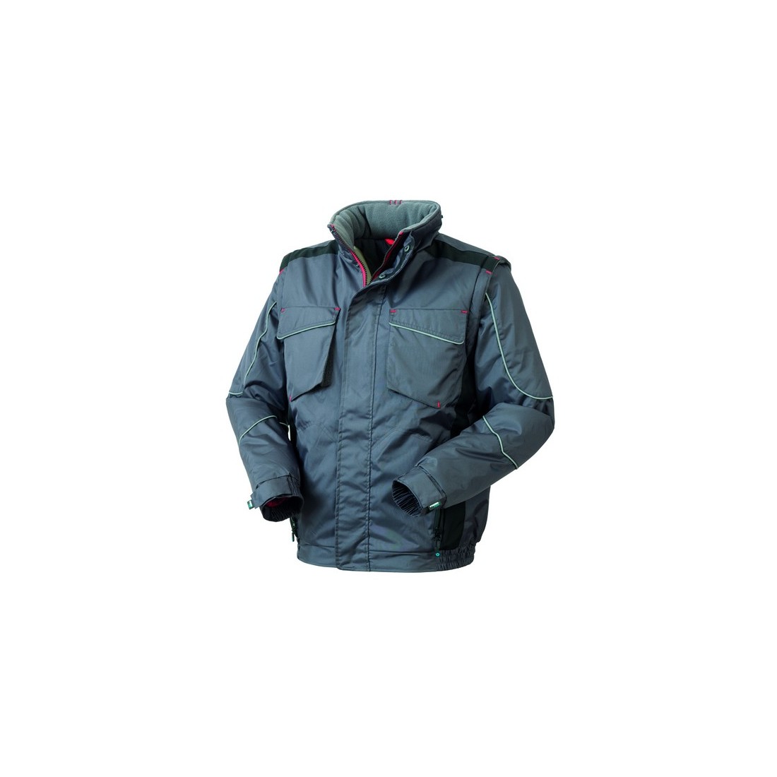 Giubbotto invernale imbottito con chiusura centrale anteriore con cerniera coperta da patella chiusa con bottoni automatici, cappuccio impermeabile interno chiuso con cerniera, maniche staccabili.